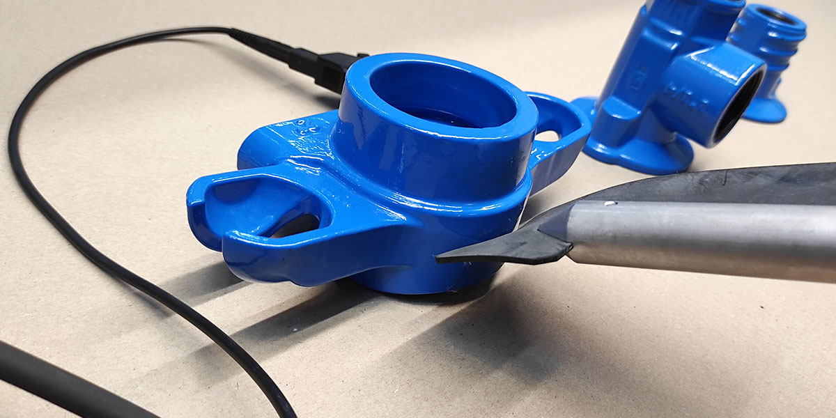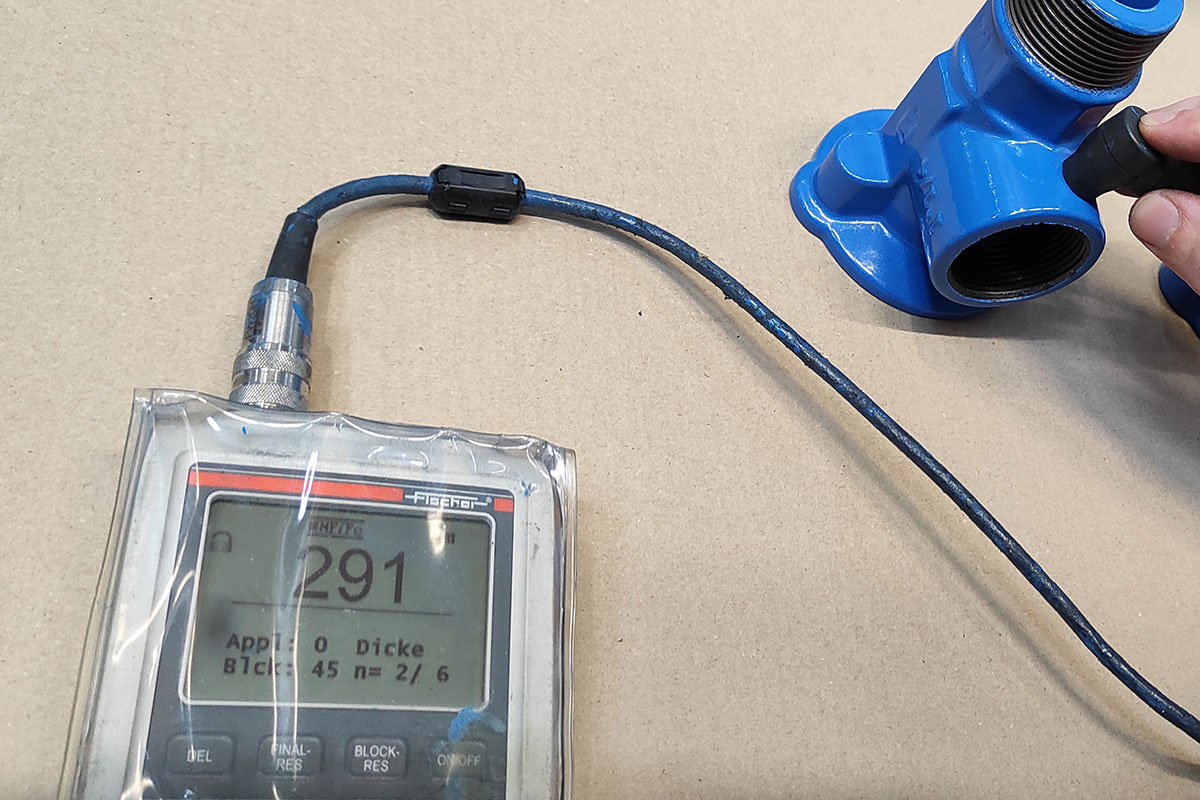 The probe of the testing device must be such that all areas and all nominal widths (internal and external) can be measured reliably. Bends should preferably be measured using single-point probes. The self-monitoring must ensure that the minimum coating thickness all over the part is not less than 250 pm.